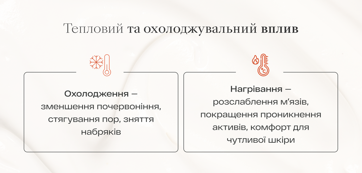 Нагрівання — розслаблення мʼязів, покращення проникнення активів, комфорт для чутливої шкіри