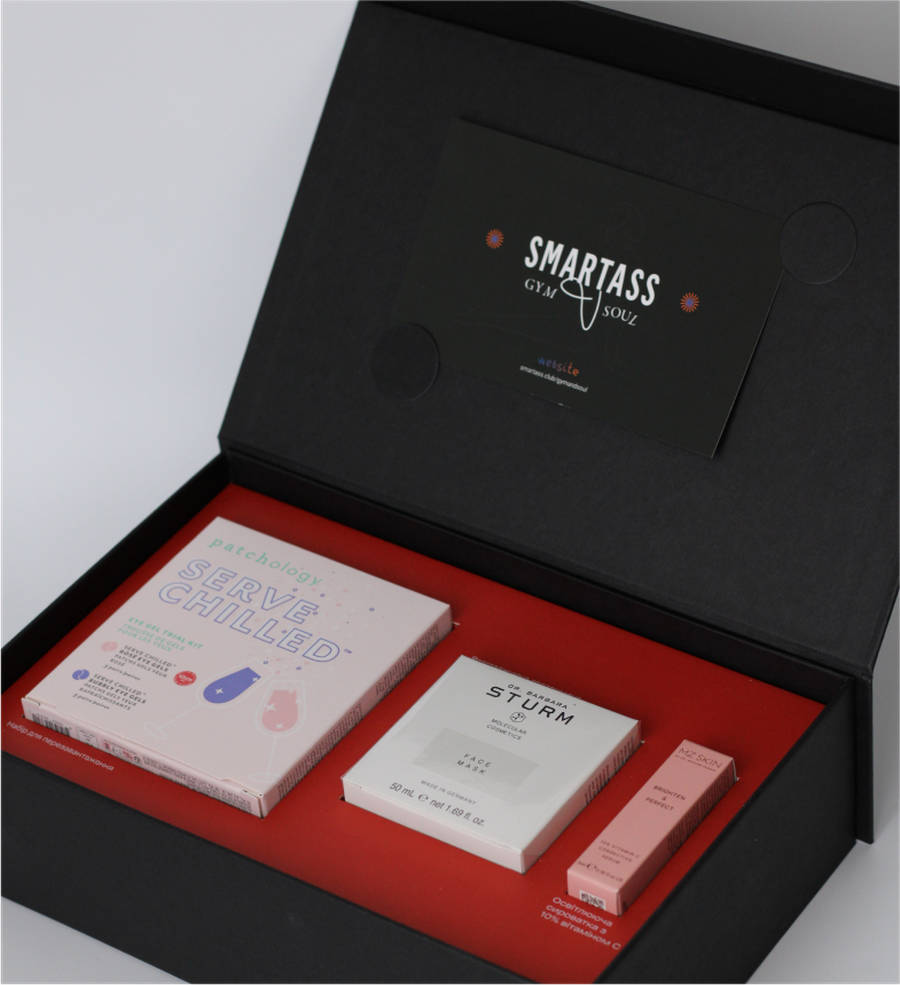 Цей бокс — результат нашої колаборації з мережею спортивних залів Smartess Gym&Soul. Stress Less Glow More Box — ключик до емоційного та фізичного відновлення, адже до складу боксу входить:
