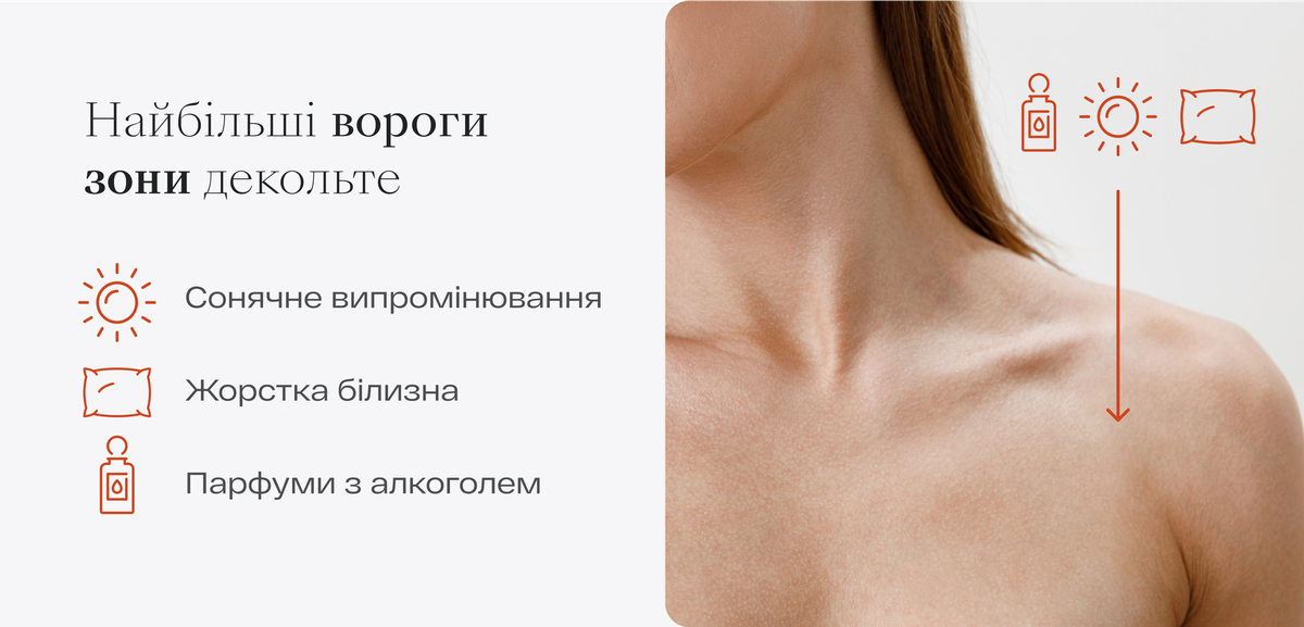 Щодо декольте, ця зона має ще одну особливість: мінімальну кількість сальних залоз. Через це вона швидше втрачає вологу, стає сухою і менш еластичною. З віком ситуація лише погіршується: знижується рівень колагену, і шкіра стає тоншою.